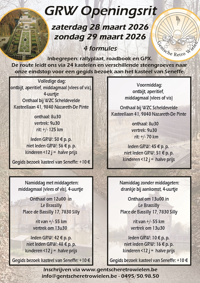 Tijdens de openingsritten op zaterdag 28 maart 2026 en zondag 29 maart 2026 is onze eindhalte het kasteel van Seneffe. Om 16 uur is er een gids geregeld voor een gegidst bezoek aan het kasteel. Deelname is 10 € per persoon. Het bezoek start om 16 uur en duurt ongeveer een uur.