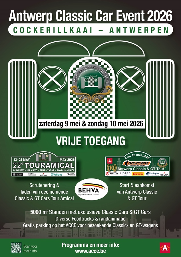 Op zaterdag 9 en zondag 10 mei 2026 vindt het Antwerp Classic Car Event opnieuw plaats aan de Scheldekaai (Cockerilkaai) in Antwerpen. Dit GRATIS te bezoeken evenement verwelkomt naar verwachting zo'n 15.000 bezoekers, 1.000 classic cars en een indrukwekkende selectie GT-wagens.