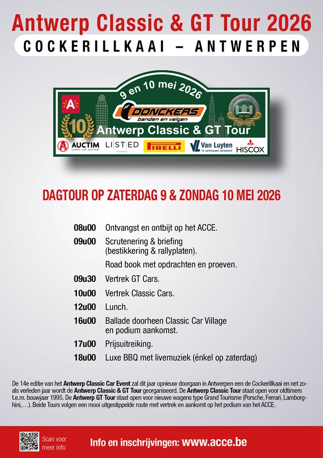 Op zaterdag 9 mei 2026 vindt de 10e editie van de Antwerp Classic & GT Tour plaats, toegankelijk voor zowel oldtimers (tot bouwjaar 1995) als moderne GT-wagens (o.a. Porsche, Ferrari, Lamborghini – 2-deurs sportwagens).