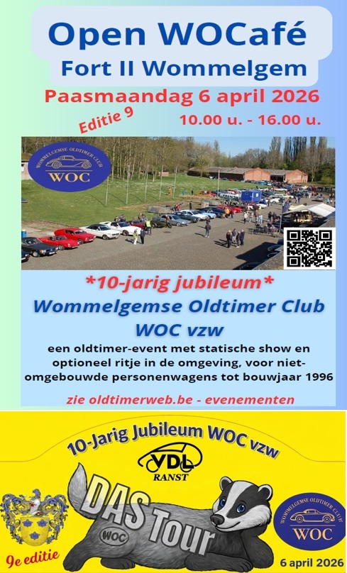 De Wommelgemse Oldtimerclub (WOC vzw) organiseert voor de 9e maal, op 6 april 2026 van 10.00 tot 16.00 u. een Open WOCafé. Dit oldtimer evenement voor personenwagen (alle merken – niet omgebouwd) tot bouwjaar 1996, zal doorgaan in het unieke kader van Fort II te Wommelgem.
