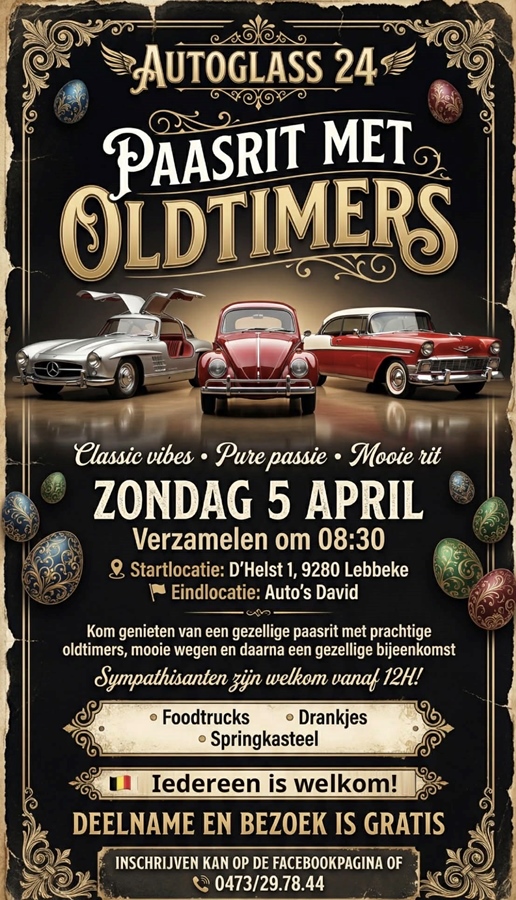 Op zondag 5 april 2026 organiseert Autoglass 24 een gezellige oldtimerrit ( VOLZET) met start in Lebbeke. Het wordt een ontspannen hobbyrit van ongeveer 40 km, ideaal om samen met andere liefhebbers te genieten van prachtige wagens en een mooie route.