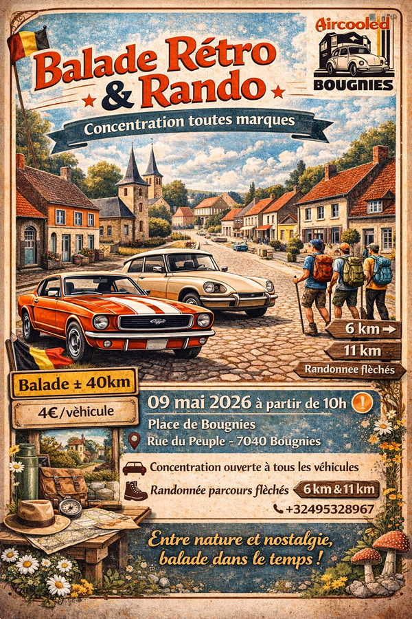 Pour la première fois, le comité d'Aircooled Village Bougnies organise une concentration toutes marques le samedi 9 mai, après 10 ans de tradition avec la concentration du dimanche !