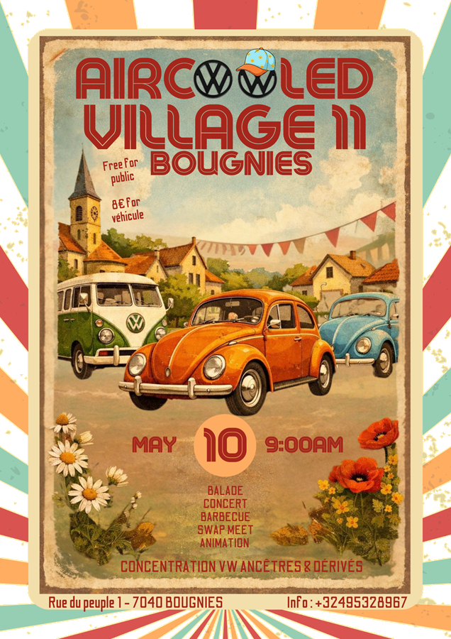 Le Aircooled Village est une concentration conviviale dédiée aux passionnés de Volkswagen refroidies par air et leurs dérivés. Le temps d'une journée, le village de Bougnies se transforme en lieu de rencontre pour les amateurs de Coccinelles, Combi, Karmann et autres VW aircooled.