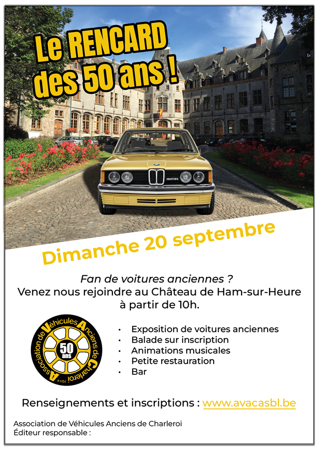 Dans le cadre des festivités des 50 ans du club de l'AVAC , la journée du dimanche 20 septembre sera ouverte à tout amateur de véhicules anciens , membres ou non membres sont les bienvenus , pour l 'exposition statique ( gratuite) ou pour une balade organisée par le club l 'après midi , pour cette dernière une préinscription est demandée , vous la trouverez facilement sur le site internet du club avacasbl.be ou directement par ce lien : https://www.avacasbl.be/wp-content/uploads/2026/03/Bulletin-50.pdf