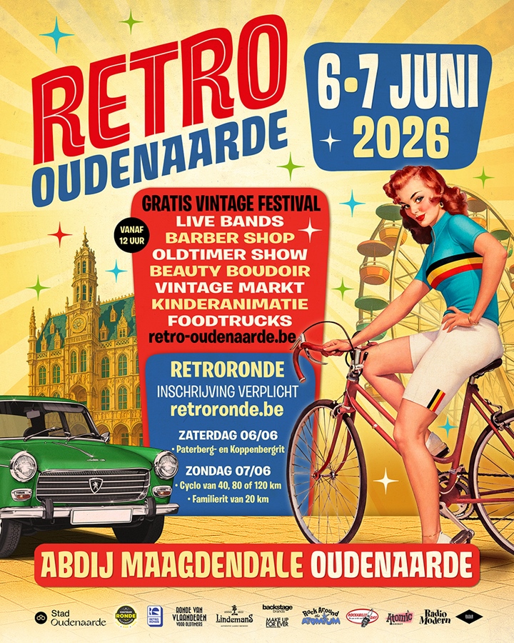 Retro Oudenaarde 2026 is een gratis vintage festival op de Abdijsite Maagdendale in Oudenaarde. Verwacht twee dagen vol oldtimers, livemuziek, vintage markt, pin-up sfeer, cocktails en de unieke retrobeleving van Retro Sur Mer. Op zondag komt ook de Retroronde van Vlaanderen aan op de festivalsite. Gratis toegang.